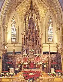 The centerpiece of the interior is the carved oak paneling and reredos of the high altar, created by the Goyers Brothers of Louvain, Belgium, in 1892.[1][2][4] The four rear panels which flank the altar contain angel figures in high relief. Each angel carries a scroll with a phrase from the hymn "Gloria in excelsis Deo." The carved work is continued on the reredos, with the Last Supper, other sacred scenes, and figures of angels and saints carried upward to a great height. Wooden panels lining each side of the sanctuary feature high-relief statues of the twelve apostles. The reredos and sanctuary area cost $25,000.[1]