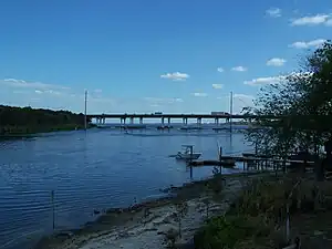 The original St. Johns River Bridge was a four-lane concrete-and-steel causeway bridge constructed over the St. Johns River at the west outlet of Lake Monroe. It is a part of Interstate 4, and spans the border between Seminole and Volusia Counties in Florida, United States. On the Seminole side is Sanford and on the Volusia side is DeBary.