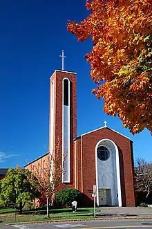 The Sisters of the Holy Names of Jesus and Mary, a Roman Catholic teaching religious institute arrived in 1863 and bought the building. It became the Sacred Heart Academy dedicated on August 22, 1863 and opened with 80 students on September 7. A church historian has noted that the then pastor Leopold Dieleman, "threw enough holy water on the building to put out a fire" and quotes Father Dieleman as saying, "The devil that day had danced his last polka in the building".[4] The following year St. John Evangelist Church opened on a rise of ground known locally as "Piety Hill".[5][6]