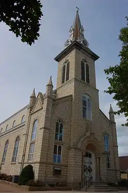 St. Joseph Church is a historic Roman Catholic church located on Main Street in Westphalia, Osage County, Missouri. The Gothic-Romanesque building was constructed in 1848. Architectural features include limestone and cottonstone construction, a frame clerestory, and an octagonal apse. A central belfry steeple was added in 1883. The entire structure was remodeled and enlarged in 1905.[2]