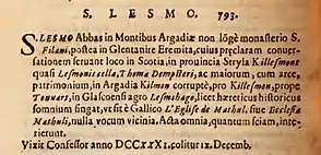 - ↑ The Latin reads as "....S. Lesmo, abbas in montibus Argadiae, non longe monasterio S. Filani, postea in Glentanire eremita, cujus praeclaram conversationem servant loca in Scotia; in provincia Stryla Killesmont, quasi Lesmonis cella Thomae Dempsteri ac majorum, cum arce, patrimonium; in Argadia Kilmon, corrupte pro Killesmon, prope Touuart; in Glascoensi agro Lesmohago, licet haereticus historicus somnium fingat, ut sit e Gallico “L’église de Mathul” sive ecclesia Mathuli, nulla vocum vicinia. Acta omnia, quantum sciam, interierunt. Vixit confessor anno DCCXXXI. Colitur ix. Decembris....". A good translation of this Latin is almost impossible. Skilful translation reads as "....St. Lesmo, Abbot in the mountains of Argadia not far from the monastery of St Filanus [St Fillan], afterwards a Hermit in Glen Tanar, whose outstanding way of life they preserve [i.e. commemorate] in Scotland, in the province of Stryla Killesmont, as if the cell of Lesmo, of Thomas Dempster, and the older people [or ancestors], with a ?high point/citadel, a patrimony, corrupted in Argadia (to) Kilmon, for Killesmon, near Tanar, in the territory of Glasgow, (called) Lesmohago, it is permitted for the heretic historian to create a dream, as is in French L’Eglise de Mathul, or the Church of Mathul, with no nearness of sounds, all his Acts [i.e. deeds, achievements], as much as I know, have perished. He lived, a Confessor, in the year 733.1. He is celebrated on December 9th....". Some of the self-references to Dempster (as writer) are confusing.