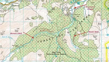 It is claimed that he "ministered" to travellers on the Firmounth path.[13] If there had been a "holy hermit" in the eighth century, it is likely that places would have been named after him. There are no examples of the name "Lesmo" in Aberdeenshire.[14] There are some claims for a Hermit’s Cave or Hermit’s Well in Glen Tanar. A Hermit’s Well was recorded near Porphyry Bridge on a 1955 UK Ordnance Survey map. This location, near the Water of Tanar, is about 4 km. to the SW of St Lesmo’s Chapel and Glen Tanar House. This site is not marked on the latest Ordnance Survey map.