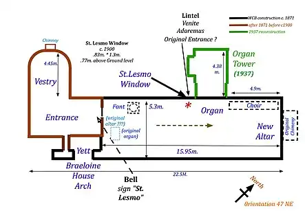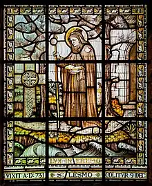 There is no reference to a Lesmo in the Aberdeen Breviary (1507).[4] This omission raises doubts regarding Lesmo and claims for his Sainthood.[5] Sixteen saints are recorded as being active during a period from c. 500 AD to c. 800 AD along the River Dee, Aberdeenshire.[6] The Aberdeen Breviary lists 81 saints, including twelve associated with Deeside.[7] Nevertheless, he is recorded by many Scottish writers in the late nineteenth and early twentieth centuries.[8] In 1871, a private Scottish Episcopal Church chapel was dedicated to Lesmo by Bishop Thomas Suther, Bishop of Diocese of Aberdeen and Orkney. The chapel was part of a grand building scheme by William Cunliffe Brooks on his new estate. The chapel has a fine stained-glass window commemorating Lesmo.[9] Lesmo stands in front of what looks like the South side of the church. Below is the aphorism, "LUX IN EREMO"; translated as "Light in the Wilderness". It has been suggested that "LUX IN EREMO", might be code for "LUX IN ER(S)MO". A second text along the bottom of the window reads “VIXIT AD 731 COLITUR 9 DEC” “He lived in AD 731 – Commemorate him on the 9th. December”. Almost certainly the face of St Lesmo in this panel is based on a photograph or cartoon of Cunliffe Brooks.[10] The designer of the window gave Lesmo a staff with a scallop shell on his left shoulder suggesting a pilgrim saint. The scallop shell refers to Saint James who is the patron saint of pilgrims and of the Camino de Santiago. It is unknown where the stained-glass was originally located as its current position, in the north wall, was the location of the original entrance into the chapel. Looking at the Lesmo window from the outside, the lintel contains an inscription “VENITE ADOREMUS” - “Come Ye, Let us Adore”.[11]