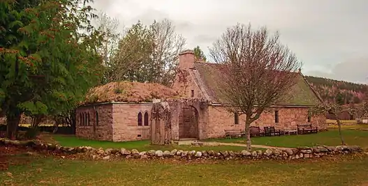 In the early 1600s a family named Garden, acquired property in Glen Tanar. In c.1639 they took up residence in what was called the House of Braeloine. In 1869 Sir William Cunliffe Brooks became tenant of the Glen Tanar estate.[17] Braeloine House was in ruins and Cunliffe Brooks undertook an extensive building programme. He built a chapel from the ruined walls of the old Braeloine House, incorporating into it, as the entrance, a yett or arched iron gateway.[18]