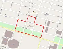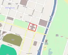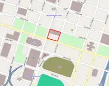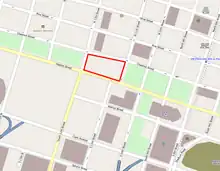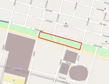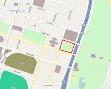 Kiener Plaza occupies the full width of the Mall between North 7th Street and North Broadway. It sits immediately north of the Ballpark Village, developed in the early 21st century. The land is owned by Southern Real Estate and Financial Company and leased to the city of St. Louis.[3]
