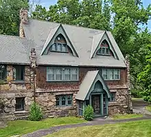 Desiring to complement the work of Village architect Bruce Price, architect William A. Potter—known for his numerous contributions to Princeton University's campus—produced a Shingle style design for St. Mary's in 1887. Critic Montgomery Schuyler described St. Mary's as a "cottage church," a term he deemed appropriate given Tuxedo's resort status.[82] Several experts, including Sarah Landau, Wayne Andrews and Lawrence Wodehouse, argue that the design for St. Mary's was influenced by the work of Henry Hobson Richardson;[83] Wodehouse attributes the "emphasis on horizontal cornices and high-pitched roofs" of St. Mary's to Richardson's 1880 design for the Dr. James Bryant House in Cohasset, Massachusetts.[84] One local influence was the nearby Tuxedo Park gatehouse, designed by Price and itself influenced by William Ralph Emerson's houses with "bouldered bases" (a phrase used by Landau to describe bases of buildings made of boulder-like stones) and Richardson's F. L. Ames Gate Lodge in North Easton, Massachusetts.[85]