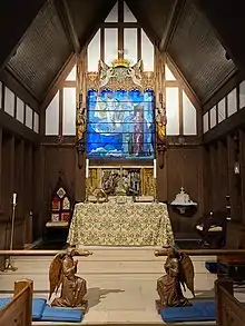 The chapel features elements taken from the Tuxedo Park homes of Richard Mortimer and Henry Morgan Tilford.[96] These include an Italian marble hearthstone taken from Mortimer's since-demolished home "Mortemar" that now serves as the chapel's altar[98] and multiple stained glass fragments that date from possibly as early as the 15th century, at least some of which were taken from the Tilford House. Several of the glass fragments are estimated to date from the 16th century.[99] The chapel was renovated in 2015.[43]