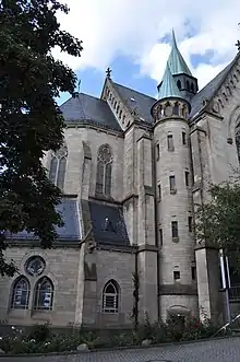 The Catholic community in Homburg grew strongly during this time. In 1866, 1,350 of Homburg's 7,400 residents professed the Catholic faith. In 1869, Bishop Ketteler made Homburg its own parish. The growing community resulted in the desire for a larger church. In 1863 a building site was acquired. These were the properties at Dorotheenstrasse 15 and 17. However, due to the Kulturkampf, construction could only begin 20 years later under the Mainz Cathedral builder, Ludwig Becker. He used the plans he originally created for St. Josef in Krefeld. In 1892 the foundation stone was laid. The inauguration took place in the presence of Queen Victoria of Great Britain on August 14, 1895. In 1915, the Marienkirche became the seat of the newly founded deanery of Homburg vor der Höhe.[3]