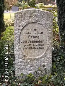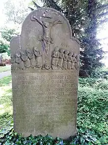 The initial cemetery was a churchyard northerly and southerly adjacent to the church building,[59] with the northerly section, the Nonnenfriedhof (i.e. nuns' cemetery), reserved for the nuns or conventuals, respectively.[60] After the 1794 redistricting the Himmelpforten parish needed a bigger cemetery.[59] Therefore the old cemetery was closed in 1797/1798 and later levelled, except of few graves, such as those of Jenny von Goeben (d. 1820), spouse of Drost Carl August Diedrich von Goeben, of Hinrich Jungen and Johann Stüven, the latter two from the baroque period.[59]