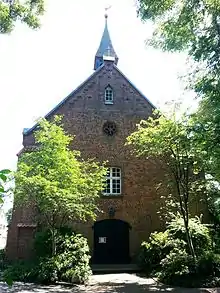A new, still functioning, cemetery was opened further east on the Main Street at the corner of Am Friedhof.[59] The timber-framed mortuary was erected in 1839 on the new cemetery.[61] Clergy, sextons and municipal officials are buried close to the Main Street, where there also are two war memorials for the soldiers killed in action in the Franco-German war and in the two World Wars. The section stretching northerly is divided by a central avenue, east of it residents of Himmelpforten are buried, west thereof gravesites serve the people from the other parish villages.[59] At the northern end of the cemetery there is a section of forest, where in 1976 the architect Uwe Oellerich from Himmelpforten built the cemetery chapel on behalf of the municipality of Himmelpforten.[59] The chapel was renovated in 2013.[62]