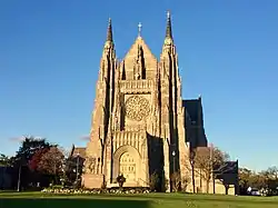 St. Mary's is a cathedral-style church located at 566 Elm Street in Stamford, Connecticut. The church is part of the Roman Catholic Diocese of Bridgeport. The main building is a Gothic Revival structure, designed by Francis L. S. Mayers and completed about 1928. It is an elegant example of French Gothic architecture, notable for the large rose window in the front-facing gable end. The rectory is a c. 1860 Italianate villa, originally built for a member of the locally prominent Wardwell family.[2]