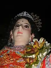 The antique statue is a detailed wooden sculpture with carved hair, draped clothing and a pair of silver shoes, she holds a crucifix on her left hand and a jar of perfume on the right hand. Her detailed carved clothing is a mixture of pink, orange, gold and a hint of light green beneath the orange draping. This detailed wardrobe is not usually seen because, by tradition, the image is always clothed with a gown, usually red in color with gold embroideries and orange, yellow or golden cape. A long wig that reaches to the hem of the gown is also placed on top of her carved hair. Three yellow strips of ribbon (or sash) is pinned horizontally to her gown to secure the wig from being displaced, and at the bottom, a pocket catches the ends of her wig. Only the face and hands are repainted from time to time, and the rest of the image's original paint is untouched.