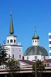 Reconstruction was based on 1961 drawings of the old cathedral by the Historic American Buildings Survey. This facilitated building a replica to the same measurements at the same location, but with modern fireproof material in its construction.[5] The materials used in the construction of the new cathedral consisted of concrete and steel with vinyl siding duplicating the original finish, roof covering of asphalt shingles (bitumen-soaked paper covered with aggregate) and copper for the roofing of the domes. The Cathedral of St. Michael was re-consecrated in 1978 by architect Sergey Padyukov.[10] The old Chapel of St. John the Baptist (The Precursor) was renamed in honor of St. Innocent Veniaminov of Alaska. All of the icons and religious artifacts were donated by wealthy Russians and Imperial government officials in the early 19th century; those saved from the fire were reinstalled in the new cathedral in the same order that had existed in the original building.[5] Its frontage is in the form of a Greek cross with a bell tower, which was "neither Byzantine nor Gothic". Similar churches are stated to exist in St Petersburg, in an architectural style dated to late 18th century and early 19th century. It has two domes and one is above the sanctum of the cross.[5]