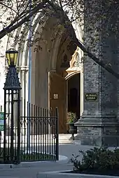The cathedral's tower supports a large iron spire located over its west entrance. At its tallest point, the tower reaches 260 feet (79 m) or approximately 26 stories above the ground,[2] surpassing the height of many of the surrounding buildings. The scale of the cathedral is quite large within the context of its immediate surroundings; however, when examined in context with the surrounding office towers, the size of the cathedral shrinks considerably. From the exterior, the building maintains a distinctly Gothic appearance characterized by its pointed arches, buttressed walls, stone moulding and sharp iron accents. The building is set-back considerably from the street and features a tall iron fence around its perimeter, which further contributes to the building's sharp appearance.[16] The fence allows the building to maintain a semi-private front yard, featuring a stone-paved roundabout on its west side and a garden along its south side. Access from the east side of the building is limited due to the connection with the cathedral's rectory.