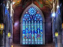 The eastern stained glass window above the altar, the focus of the church's interior is the stained glass window of the crucifixion. The tableau was installed in 1858 by Étienne Thévenot, a French pioneer of the medieval glass revival. Blue, yellow and red are the most prominent colours in the window. The deep blue sky with small blood-red squares of glass leading in the regular grid fall into larger and smaller bands of maroon, plum, and purple enlivened by emerald, viridian and gold. The central panel of the oculus is a depiction of the Blessed Sacrament symbolizing the resurrection of Jesus Christ. Underneath the stained glass window is an intricate wooden reredos with gold and green detailing.