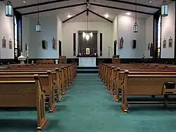 Mass was first celebrated in Mechanicsburg in 1859,[5] the parish was canonically erected in 1865,[6] and it gained a more permanent organization in 1880.[3]: 513 By the end of the 1880s, the parish had witnessed the completion of its church building on Walnut Street. In its earlier decades, the membership included many families who lived in the countryside surrounding Mechanicsburg, and the members' devotion to their church prompted a local author to declare them "extremely faithful in attendance on its services".[5] The parish obtained a rectory in October 1904; a woman who lived on Walnut Street died in that month, and her will included a provision donating her house for use as a rectory. By 1917, the membership consisted of 38 families comprising 135 individuals. The parish operated a Sunday school and multiple small groups for various activities, including a branch of the Society of the Holy Name.[3]: 514