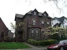 Design of St. Michael's Rectory (1877–78) is attributed to either George Brooke or Furness,[7] and the brownstone residence became another gift of the Brookes. Later alterations — changing the roof, moving the entrance to a 3-story addition (with bathrooms above), adding a bay window where the original entrance had been — are attributed solely to Furness, and probably were done at the same time that the church was expanded.[8] Furness's alterations are visible in an 1890 panoramic view of Birdsboro.[9]