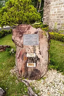 At the northwest corner of the church is a memorial stone erected in 1988, commemorating the 100th anniversary of the parish. On the stone, a metal plate is fitted with the inscription: