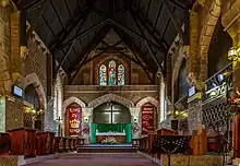 The sanctification of the main nave was made on 30 September 1906 during Michaelmas. The western portal, which is the main entrance to the church, was not completed at that time and was consecrated only in 1925, 32 years after construction began. In May 1941 Rev Reuben Henthorne and Rev Denis W.A. Brown were interned by the Japanese. Services continued at the church until 1943 when it was closed and used as a store. The church was dynamited by the Japanese forces before surrender in 1945 as World War II ended, although the shell of the church remained standing.[6] Reconstruction began soon after the war, and St Michael's is still one of the few historic stone buildings in Sabah. The coloured stained glass windows were donated to commemorate the 60th anniversary of the end of the World War II by Australians.[5]