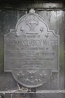 One of the most illustrious members of the Society was the Honourable Thomas D’Arcy McGee, the poet, newspaper editor and Member of Parliament for Montreal West, whose great eloquence played a crucial role in the formation of the Dominion of Canada. Despite his fame and position, he was expelled from the Society in 1868 as a result of his strong condemnation of the Fenian movement, because the Society had by then been taken over by a majority of Fenian members or sympathizers. Shortly after his expulsion from the Society, McGee was assassinated in Ottawa on April 7, 1868. Perhaps somewhat hypocritically, the Society forwarded a letter of condolence to his family expressing their abhorrence of the crime and arranged for his burial in Notre Dame des Neiges Cemetery on Mount Royal. His tomb has ever since been looked after by St. Patrick’s Society. At the 178th annual meeting, held June 19, 2012 at the Hyatt Regency Hotel, the members witnessed a highly informative and entertaining debate between David Wilson and J. Peter Shea, the Society's historian, about the merits of reinstating McGee's membership posthumously. After the debate, which lasted forty minutes, the members present voted overwhelmingly in favour of reinstatement after 144 years as a Society outcast.