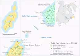 St. Paul Island (French: Île Saint-Paul) is a small uninhabited island located approximately 24 km (15 mi) northeast of Cape North on Cape Breton Island and 71 km (44 mi) southwest of Cape Ray on Newfoundland; it is along the boundary between the Gulf of St. Lawrence and the Cabot Strait.