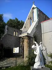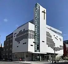 In 1970, the original Gothic church structure was destroyed by fire as a result of arson.[1] The vestry voted to remain in the same location and carry on an active ministry within the community. The Parish Hall, which was left standing behind the footprint of the old church, was also transformed into the simple, modern worship space parishioners use today. The rest of the building became a center for community meetings and various recovery groups. St. Thomas' leaders later decided to convert the area where the old church building stood into a neighborhood park.