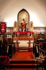 In 1841, the Episcopal Diocese of Virginia formed what was named the Holston Parish, the bounds of which included all of Washington County.[2] Parishioners met at the Washington County Courthouse as they organized themselves into a congregation which they named for Saint Thomas the Apostle.[2] The parish gonfalon depicting the symbols of Saint Thomas, the carpenter's square and the spear, stands beside the altar.[3]
