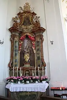 Ignaz Waibel created the sculpture of the Good Shepherd around 1700, which is placed in the choir room[15] opposite the 18th century figure of St. Nepomuk. In the rear part of the nave, on one side, there is a sculpture of St. Odile, made around 1500, which used to be in the small Gothic chapel of St. Ottilie on the outskirts of the village, and on the other, a statue of St. Anthony of Padua.