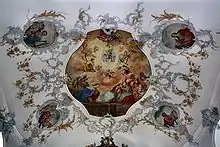 At the four corners of the ceiling fresco there are oval frescoes with the evangelists: At the bottom left Matthew with the winged man, at the top left Luke with an easel and the bull, at the bottom right Mark with the lion and at the top John with the eagle.