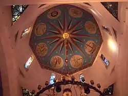 Around the dome there are various symbols, including the figure of Jesus Christ; the Holy Spirit represented by a dove; the Greek letters alpha and omega superimposed on the scriptures; wheat and grapes representing the Eucharist; and the Phoenix symbolizing resurrection etc.[2] A series of high, narrow, stained-glass windows are set into the main walls of the cathedral below the dome depicting scenes in the life of Christ and early Christianity in Armenia. The patron saint of the cathedral, St. Vartan, is depicted fighting the Sassanid Persians who threatened the Armenian Church during the fifth century. Ecumenism is symbolized in the portrait of St. Nerses and the crosses of Christendom.[2]