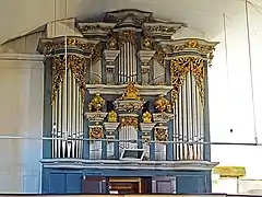 Johann Rudolph Ahle was the cantor at a predecessor instrument in the 17th century, which was built by Johann Georg Kummer from Dachwig. The present organ was built in 1987–1989 by the company Mitteldeutscher Orgelbau A. Voigt from Bad Liebenwerda in the historical organ case from 1787, partly reusing pipe material from the predecessor organ. The instrument has 25 stops on two manuals and pedal. The actions are mechanical.[4]