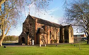 The 1950s saw the erection of a complex of ancillary buildings next to the church on its north east side providing a hall, kitchen, offices, toilets and storage for the church. They are of a fairly utilitarian 1950s design. Other than the hall, where rough cast is widely used on the exterior, these ancillary buildings were built with a darkish red brick similar to that used in places on the main church building. The church hall is dedicated to the remembrance of members of the "Church of Scotland and kindred presbyterian churches who gave their lives" in the Second World War.