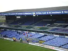 An annual survey conducted during the 2020–21 season revealed the need for repairs to remedy the effects of water ingress on both Kop and Tilton Road Stands. Although the upper tiers were expected to be usable by the first home match of the 2021–22 season, resulting in a temporary reduction of total capacity to 19,000, the deadline for full completion was not until May 2022.[47] However, the upper Tilton did not reopen until a month into the season, the upper Kop took a further six weeks,[48] and May 2022 ended with the club still awaiting full results of site investigations.[49] Work began during the 2022–23 season to demolish and rebuild the lower tiers, which had remained closed because of what was eventually revealed to be asbestos-related damage.[50][51] Installation of rail seats to permit safe standing in the lower tier of the Tilton was due to complete in September 2023, and the Kop was expected to fully re-open two months later.[51] Work stopped after main contractors Buckingham Group filed for administration in mid-August,[52] and resumed in mid-September under the management of Mace Consult, with completion expected by the end of November.[53]