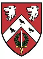 ![]() Arms: Gules, on a chevron between in chief two lions heads erased argent, and in base a sword of the second pummelled and hilt or and enfiled with a wreath of laurel, three ravens, all proper | ||||||||||||||||||||