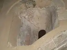 Above the western arch is the remains of an 11th-century window.[27] This had been blocked off when the south aisle and arches were constructed in the early 14th century and was restored in 1896.[29] On the south side, on what was originally the exterior wall, it has an arched lintel and jambs of two very wide blocks each and no sill. The aperture is about 9 in (0.2 m) wide and 2 ft 0 in (0.6 m) high.[29] The north face is widely splayed, with a round head of three long voussoirs; the window is about 3 ft 5 in (1.0 m) high to the springing.[29] On the eastern splay of the window are remnants of a wall painting, which have been dated to 1220.[17][26] The painting is part of the Christmas story and shows the shepherds with a dog looking up to the Star of Bethlehem. Above them are the arms of an angel pointing to the star and holding a palm branch.[26]