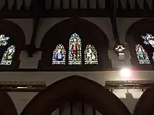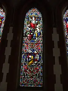 Inside, a set of excellent stained glass windows.[8] being of good-quality, intact and an extensive scheme of stained glass, designed by Hardman & Co.[6] who were also responsible for the stained glass in the Houses of Parliament. Those in the North aisle are illuminated allowing them to be viewed despite them having no natural light being enclosed as a security measure. The restoration was made possible by a donation from a late parishioner and the windows blessed at Easter 2010 with the following words; Almighty and eternal God, we give you thanks and praise for these stained glass images of your saints. For as often as we look on these images with our bodily eyes, As we look at them may we consider the actions of your saints and think about their sanctity for our inmitation. Bless and sanctify these windows made in honour and in memory of your only begotten Son, our Lord Jesus Christ and of these saints. We also remember our faithful servant John Ellison in whose memory these lights were re-installed. May the light of Christ always shine in our hearts. Amen[14]