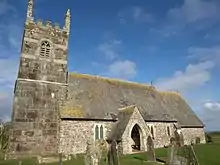 Parts of the church, which is built in the Decorated style, are of thirteenth century origin and the tower dates from around 1400. The thirteenth and fourteenth century nave and chancel were rebuilt in 1862−63, incorporating some of the original structure to the designs of the architect Edward William Godwin of Bristol. The construction is mainly of rubble stone, with some large blocks of granite and serpentine in the tower. There are separate slated, steeply-sloping roofs for the nave, chancel, vestry and porch. The unbuttressed tower is at the west end and has two stages.[1] The font from the previous church was retained. The serpentine and Caen pulpit was the gift of the Lizard Serpentine Company. The lectern was the gift of Mr Cox, the agent of the company. The church was reopened for worship on 24 July 1863.[3][4]