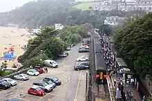 The line was proposed for closure following the Beeching Report and, because of this, was mentioned in the song "Slow Train" by Flanders and Swann.[5] The line however was reprieved, but the original curved station was closed on 23 May 1971 and a new, straight, platform opened on the site of the goods shed to replace it.[6] The site of the original station is now a car park, but the railway also brings people from the Park and Ride car park at St Erth.