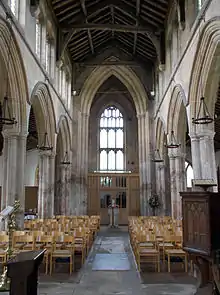 The nave north and south arcades leading to the north and south aisles are of three bays each, and date to the 13th century. The arcade pointed arches, of double-faceted flat and rounded mouldings, sit on piers incorporating four rounded columns each with a central raised flat projection continuous along the full length. Between each rounded column is a continuous annulet (flat hollow). The piers' capitals and abaci are flat-faced Doric of five sides; the deep base octagonal and moulded. A continuous hood mould runs above the arches throughout each arcade. The 15th-century nave roof is of tie beam construction; it was restored in the 19th century when stone corbels and cross braces were replaced. Within the nave, beneath the tower arch, is a 14th-century octagonal font (PastScape: 15th-century). The stone plinth and bowl is panelled on each side: the plinth with plain recessed fields, each alternate with carved twin flower-head reliefs; the bowl with panels of carved quatrefoils with inset shields, alternating with blind tracery. A font cover is of plain wood, with eight raised pink open scrolls attached meeting an octagonal shaft topped by a gold-painted urn.[1][8]