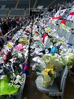 Sir Bobby Robson, a lifetime Newcastle fan who managed the club from 1999 to 2004, died of cancer aged 76 on 31 July 2009, five days after having been at St James' Park to watch the England v Germany charity trophy match played in his honour and in aid of his cancer foundation. Immediately after his death, St James' Park became an impromptu shrine to Sir Bobby, with thousands of fans leaving floral tributes, club shirts and scarves in the Leazes End for the following ten days. After a private funeral service on 5 August, a thanksgiving service held on 21 September at Durham Cathedral in Sir Bobby's memory was broadcast on two big screens for spectators in the Leazes End.