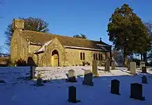 In the churchyard is a medieval sandstone cross base.[6] It is roughly octagonal in shape with a diameter of about 3 feet (0.9 m), and is about 2 feet (0.6 m) high.[1] The cross base is listed at Grade II.[6]