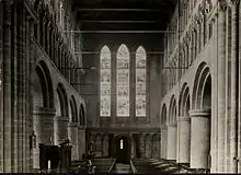 While the external fabric of the church is largely Early English in style due to the Victorian restorations, much of the interior consists of Norman material.[12] This is present in the nave, the crossing, the first bay of the chancel, the arch to the Lady Chapel and in the remains of the choir chapels.[14] Richards considers that it is the best masonry of the Norman period in Cheshire.[1] Inside the church are many early effigies which are all damaged, some dating back as far as the late 13th or early 14th century.[1][2] Monuments to the Warburton family are in the Lady Chapel. In the church are two fonts, one dating from the 15th century, the other from the Commonwealth period. Two brass chandeliers are dated 1722.[1] The pulpit is from the 19th century. The reredos, dated 1876, is by John Douglas and was made by Morris & Co.; it includes a painting of the Last Supper.[2] The organ had been built as a temporary organ for the coronation of Queen Victoria in 1838 by William Hill and Company of London. It was then rebuilt for St John's, transported to Chester by barge and installed at the west end of the church. It was opened on 28 October 1838 with the opening recital given by Henry Gauntlett as he could actually play the pedals. In the 1859–66 restoration it was moved to the south transept and in 1895–96 it was moved to the north transept, when the organ was put in its current case. In the 1960s it was converted to electro-pneumatic action by Charles Whiteley and Company. In 2002 it was restored by Rod Billingsley following vandalism.[15] The organ case dated 1895 is by Thomas M. Lockwood. A memorial to Lockwood is in the north aisle. The stained glass in the east window dated 1863 was designed by T. M. Penson and made by Clayton and Bell. The west window was designed by Edward Frampton and is dated 1887–1890. In the north aisle is a barely visible wall painting of St John the Baptist.[14] The church contains nine memorial boards by members of the Randle Holme family.[16] Also inside the church are fragments of late Saxon stone crosses that are thought to have been originally in the churchyard.[17] The parish registers begin in 1559.[1]