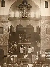 St Joseph's Church is a Roman Catholic Parish church in Aldershot, Hampshire. Built in 1913, it is situated at the top of a ridge on Queens Road, overlooking the town centre, between the Municipal Gardens and Princes Hall. It is a Grade II listed building.[1] Sir Nikolaus Pevsner described it as 'One of the most impressive churches of its date, brilliantly planned on a triangular site.'[3]