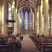 In 1270 a three-nave Gothic hall church was built on the site.[3] The west tower was extended again at the same time, this time with an additional storey taking it up to 40 metres. The facade of the 1270 extension contains a 1302 Jewish gravestone looted during the 1350 Pogroms.[4]