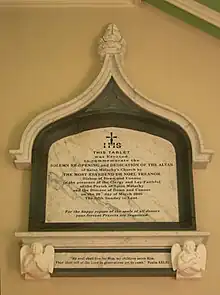 The Church was designed by Thomas Jackson of Waterford and it is in the ecclesiastical style of the Tudor period. It is cruciform in shape, 113 feet wide, 52 feet wide and 40 feet high. The original High Altar, Pulpit and Altar Rails were of Irish Oak however they were replaced with marble when the Church was renovated in 1926. All that remains of the original ornaments is the canopy over the pulpit which has been painted white to match the marble of the present altar furnishings. The Sanctuary floor is mosaic, the principal colour being blue. At the foot of the Altar is a pelican, a common Christian symbol of sacrifice.