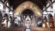 The war memorial and high altar were added in 1921, designed by Reginald Fairlie. A baldachino was added in 1927.[4] In 1932 the height of the roof was increased by Reid and Forbes.[6]