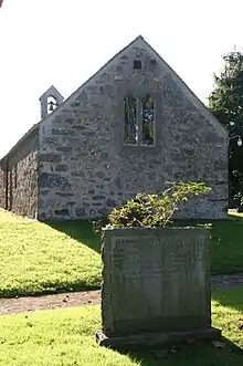 The church is built from rubble masonry, dressed with sandstone, and measures 47 by 14 feet (14.3 by 4.3 m).[3][8] The entrance is at the west end of the north wall. The roof, which is made from slate, has a bellcote with one bell at the west end. The inscription on the bell states that it was cast in 1582, and the bell is also marked with a fleur-de-lys and the thrice-repeated initials "AMN".[3]