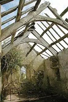 Inside, little remains, but the ruins still have most of the original roof trusses (one, at the west end of the church, is a replacement).[2] There are some slate memorial tablets on the walls, dating from the middle of the 19th century, and a plain 12th-century circular font.[2][5] The 1937 survey noted a bell dating from 1717 and some portions of 17th-century panelled seating near the pulpit; these were not recorded when the church was given listed status in 1970.[2][4]