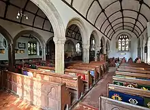 The entire church was re-roofed and extensively renovated. The building was reseated in pitch pine, the chancel refitted in wainscot and the floor relaid with encaustic tiles, supplied by Webb of Worcester. With the removal of the galleries, additional space was made with the creation of a new south aisle, the arches of which are constructed of granite from Bere Alston. During the restoration an ancient fireplace was discovered and its flue utilised for the new heating apparatus. The Earl commissioned Messrs. Lavers and Barrand of London to create a memorial window in remembrance of his aunts, Lady Brownlow and Lady Caroline Macdonald, and his father's elder brother.[4]