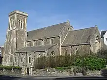 The plans provided for a tower and a large spire. The latter was never added, but in 1872 a tower was built at the southwest corner.[1][15][16] Other work carried out in this year included the addition of an organ chamber (in the form of an apse) and a vestry, and a new east window in the chancel.[16] Stained glass windows by Morris & Co. were added in 1882. A church hall, a simple brick structure, was built on the northwest side in 1935.[1]
